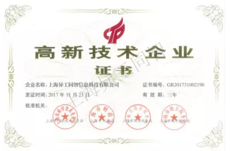 根據(jù)“高新技術企業(yè)認定管理辦法”和“高新技術企業(yè)認定管理工作指引”有關規(guī)定,經(jīng)過全國高新技術企業(yè)認定管理工作領導小組辦公室、上海市科委、上海市財政局、上海市國稅局、上海市地稅局等有關部門的嚴格審核,上海異工同智順利通過上海市2017年高新技術企業(yè)認定,證書編號為:GR201731002190。