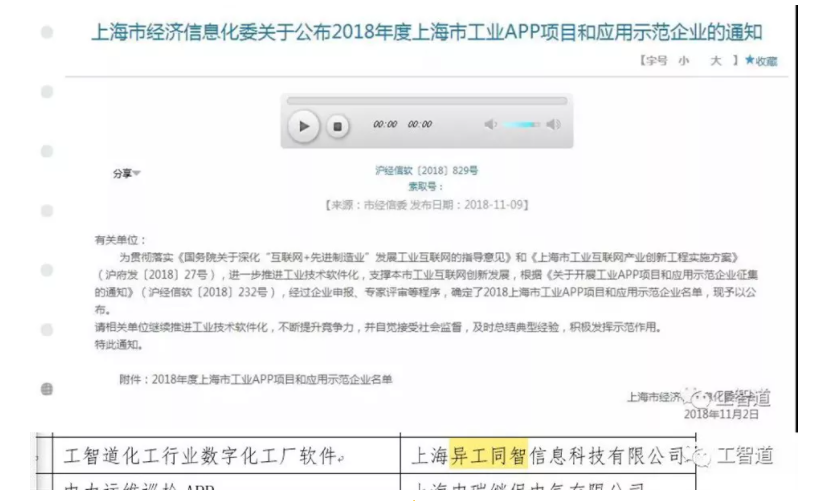 在上海市經濟信息化委公布的2018年度上海市工業APP項目和應用示范企業通知中,憑借“工智道化工行業數字化工廠軟件”榮幸登榜。